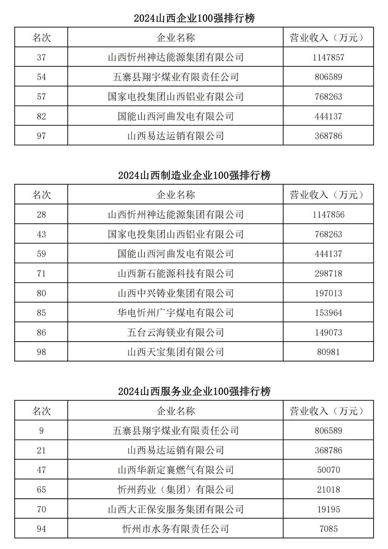 今年是山西省企業(yè)聯(lián)合會、山西省企業(yè)家協(xié)會連續(xù)第二十一年向社會發(fā)布“山西企業(yè)100強排行榜”,同時發(fā)布《山西企業(yè)100強(年度)發(fā)展報告》。2024山西企業(yè)100強營業(yè)收入總額26041.18億元,比上年略有降低;入圍門檻35.8億元,比上年增加了5.32億元,平均資產(chǎn)總額比上年增加了17.63%,平均凈利潤比上年增長了0.49%。晉能控股集團有限公司以營業(yè)收入4505.2億元排名第一;山西焦煤集團有限責任公司以營業(yè)收入2373.89億元排名第二;潞安化工集團有限公司以營業(yè)收入1730億元排名第三。2024年山西省百強企業(yè)中有2家企業(yè)躋身世界企業(yè)500強;有10家企業(yè)入圍中國企業(yè)500強;有5家企業(yè)入圍中國制造業(yè)企業(yè)500強;有3家企業(yè)入圍中國服務業(yè)企業(yè)500強。