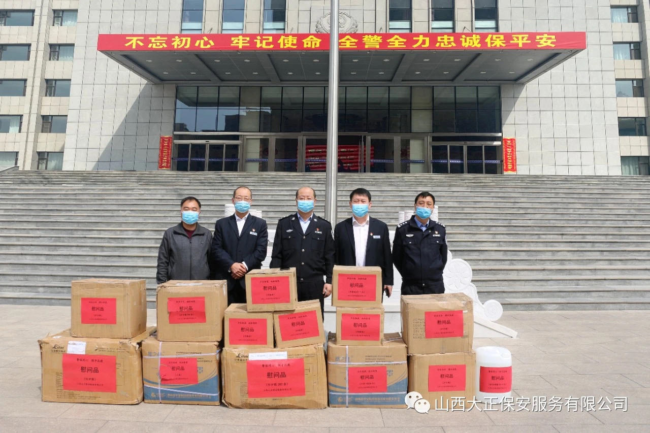 3月31日,山西大正保安服務(wù)(集團(tuán))有限公司黨委委員、副總經(jīng)理趙培宏、副總經(jīng)理王明生領(lǐng)導(dǎo)一行,專程來到市公安局,捐贈(zèng)了醫(yī)用口罩12000、防護(hù)服200套、護(hù)目鏡500個(gè)、消毒液80㎏、醫(yī)用酒精25㎏,表達(dá)公司和干部職工對公安民警疫情防控的支持;對警保同心、聯(lián)手抗疫的信心、決心;對廣大公安民警健康的關(guān)愛。忻州市公安局副局長王雷接過物資后,代表市局對大正集團(tuán)公司的捐贈(zèng)表示感謝。