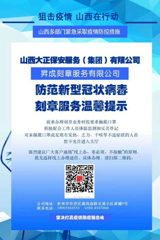 山西大正昇成刻章服務(wù)有限公司將繼續(xù)響應(yīng)集團公司號召,在疫情期間嚴(yán)格落實各項規(guī)章制度,并通過線下線上齊發(fā)力的方式迎來業(yè)務(wù)加速拓展。