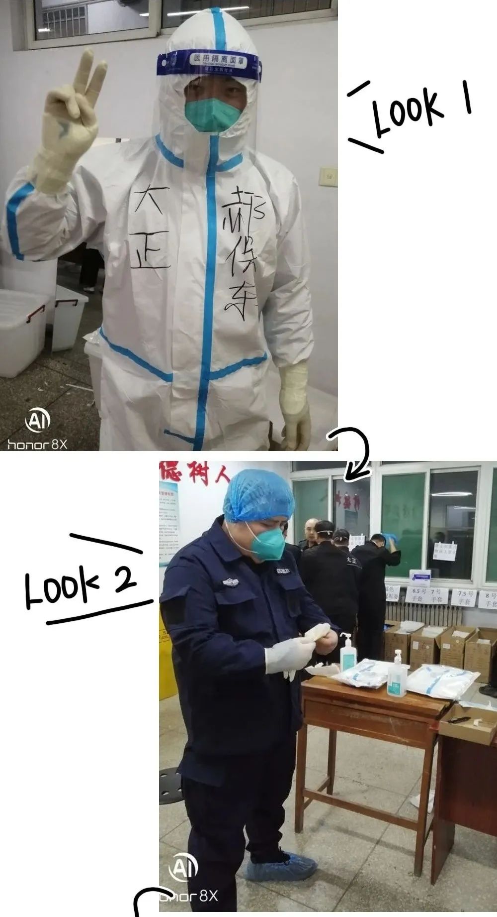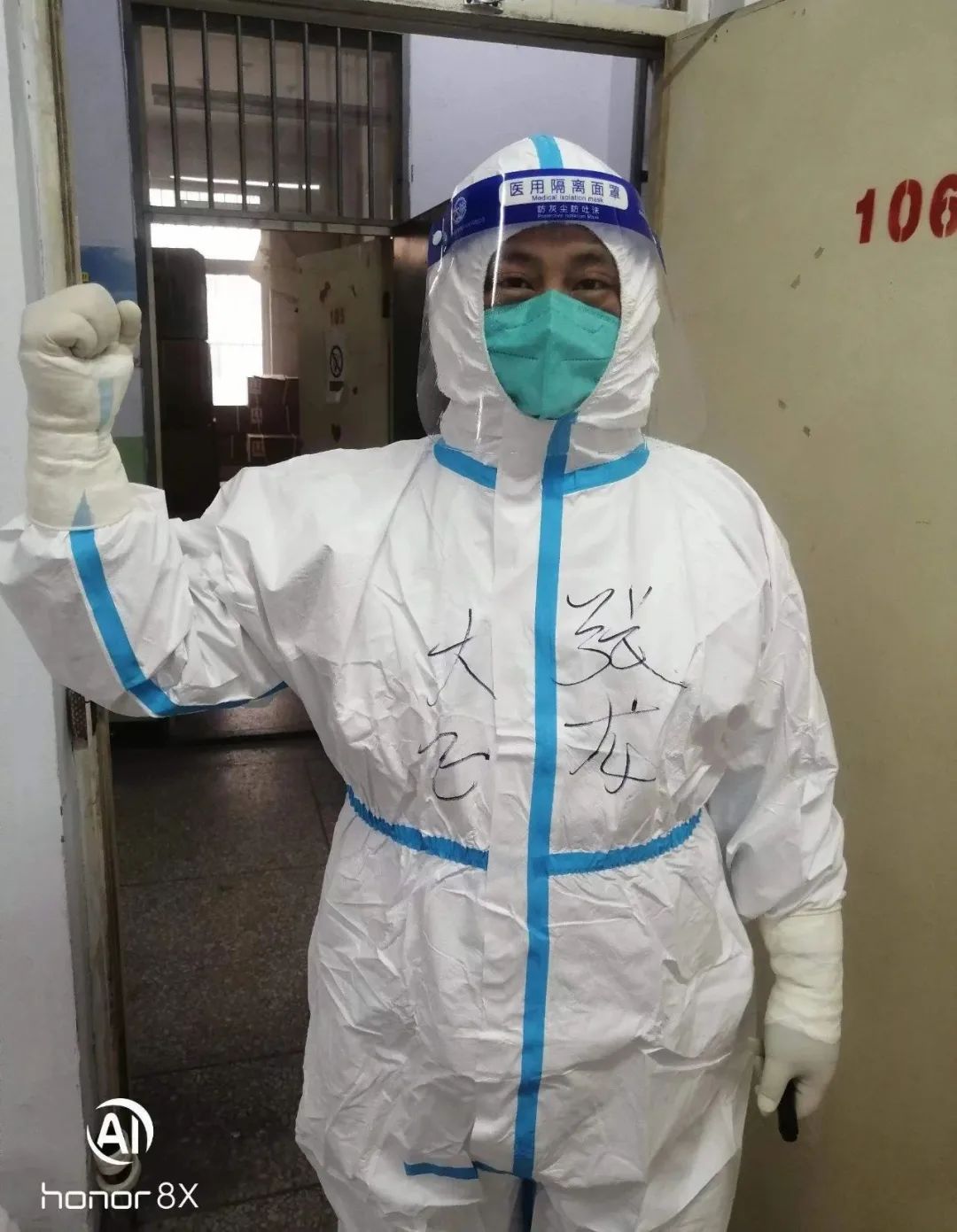 11月16日晚上6點,是他們第一次穿著防護服進入隔離區(qū)為隔離人員高風險近距離服務(wù)。關(guān)向宇同志身體高大肥胖,穿脫防護服要比常人艱難的多,為盡職責完成任務(wù),自己克服困難,知難而上,跨入隔離區(qū)。二人在隔離區(qū)服務(wù)近四個小時,出來時滿身流著汗水,第二天兩人都發(fā)生了身體不適狀況,身體發(fā)冷、咳嗽等癥狀,但是他們沒有畏縮,提振精神,繼續(xù)馬不停蹄的干活,該干啥干啥,該做什做什,忙里又忙外。