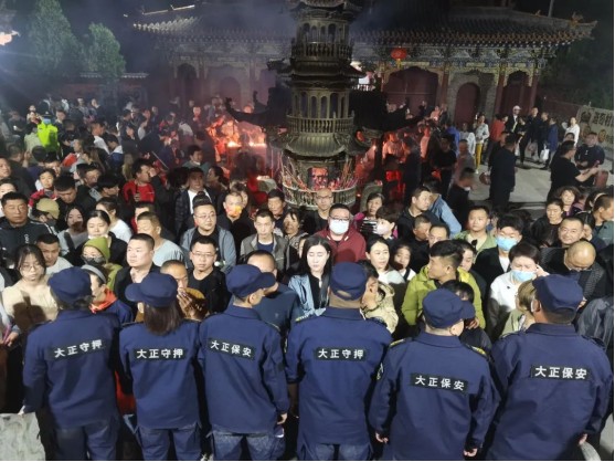 凌晨0點過后,車流量、人流量逐步增多,還愿、許愿香客絡繹不絕,執(zhí)勤隊員一邊要維持秩序,一邊還要檢查是否攜帶香火蠟燭燈等易燃物品進入寺廟。凌晨0時直到次日中午12時在長達 24個小時的時間里,公司帶隊領(lǐng)導和隊員們始終堅守在一線,充分體現(xiàn)了大正保安人紀律嚴明、吃苦耐勞、能打硬仗、團結(jié)一致的優(yōu)良作風。執(zhí)勤中,全體保安隊員堅守崗位、履職盡責、文明執(zhí)勤,維持秩序、服務群眾,營造了安全祥和的氣氛,圓滿完成了此次廟會安;顒樱故玖藝蟊0矊I(yè)水準和良好的精神風貌。