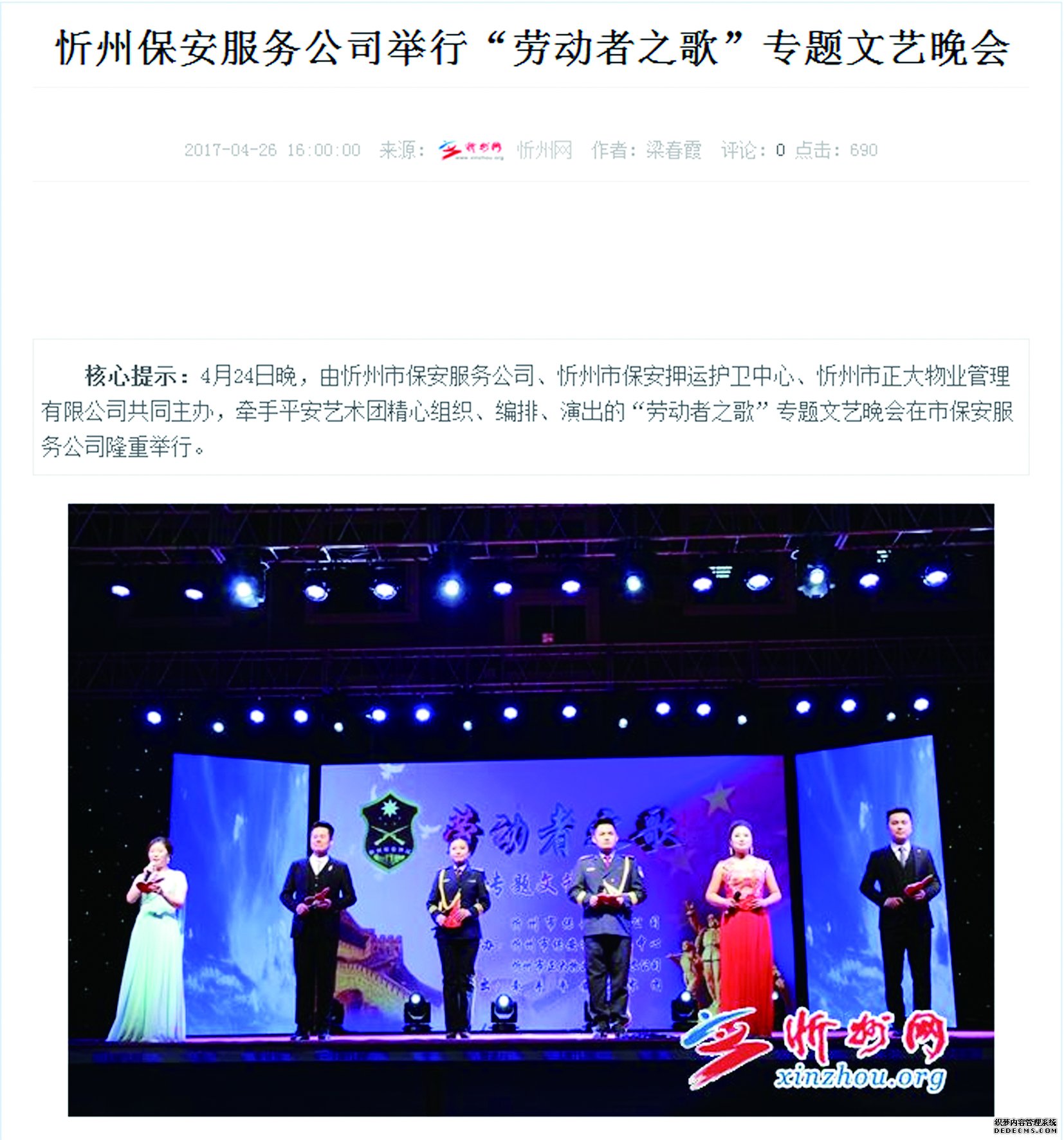 值“五一”國(guó)際勞動(dòng)節(jié)、“五四”青年節(jié)來(lái)臨之際,我公司成功舉辦“慶五一·迎五四”系列文體活動(dòng)。在公司西區(qū)大院舉行“勞動(dòng)者之歌”專(zhuān)題文藝晚會(huì)。舉辦這次活動(dòng)為進(jìn)一步豐富員工文化生活、促進(jìn)溝通交流、增強(qiáng)團(tuán)隊(duì)凝聚力,提高廣大員工的歸屬感和主人翁意識(shí),打造和諧共贏的企業(yè)文化,樹(shù)立企業(yè)良好的社會(huì)形象。向長(zhǎng)期以來(lái)關(guān)心、支持公司事業(yè)發(fā)展的社會(huì)各界人士表示衷心的感謝。節(jié)目?jī)?nèi)容包括舞蹈、配樂(lè)詩(shī)朗誦、制式服裝秀、歌曲、小品、曲藝、戲曲等。異彩紛呈的節(jié)目博得觀(guān)眾陣陣掌聲,吸引了眾多市民駐足欣賞。